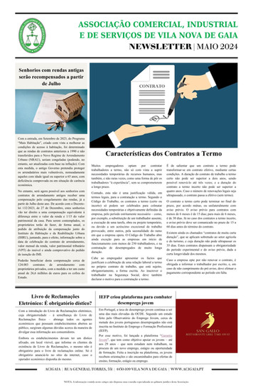 No sentido de informar os nossos associados sobre as novidades e oportunidades que lhes são mais relevantes, bem como consciencializá-los acerca dos seus direitos e deveres, a Associação Comercial, Industrial e de Serviços de Vila Nova de Gaia disponibiliza, para consulta geral, a sua Newsletter de Maio de 2024, com um pequeno sumário das notícias mais pertinentes deste mês.